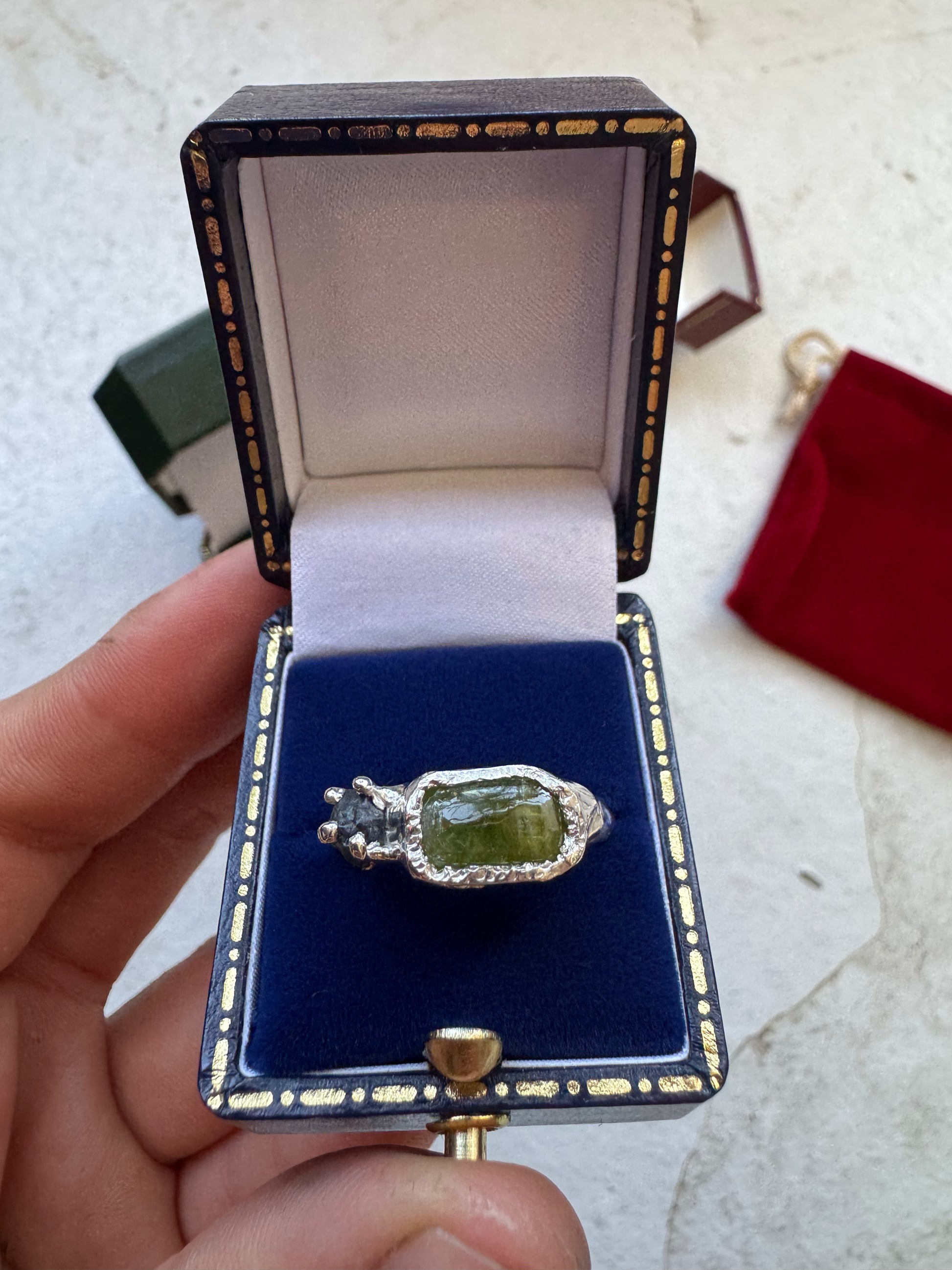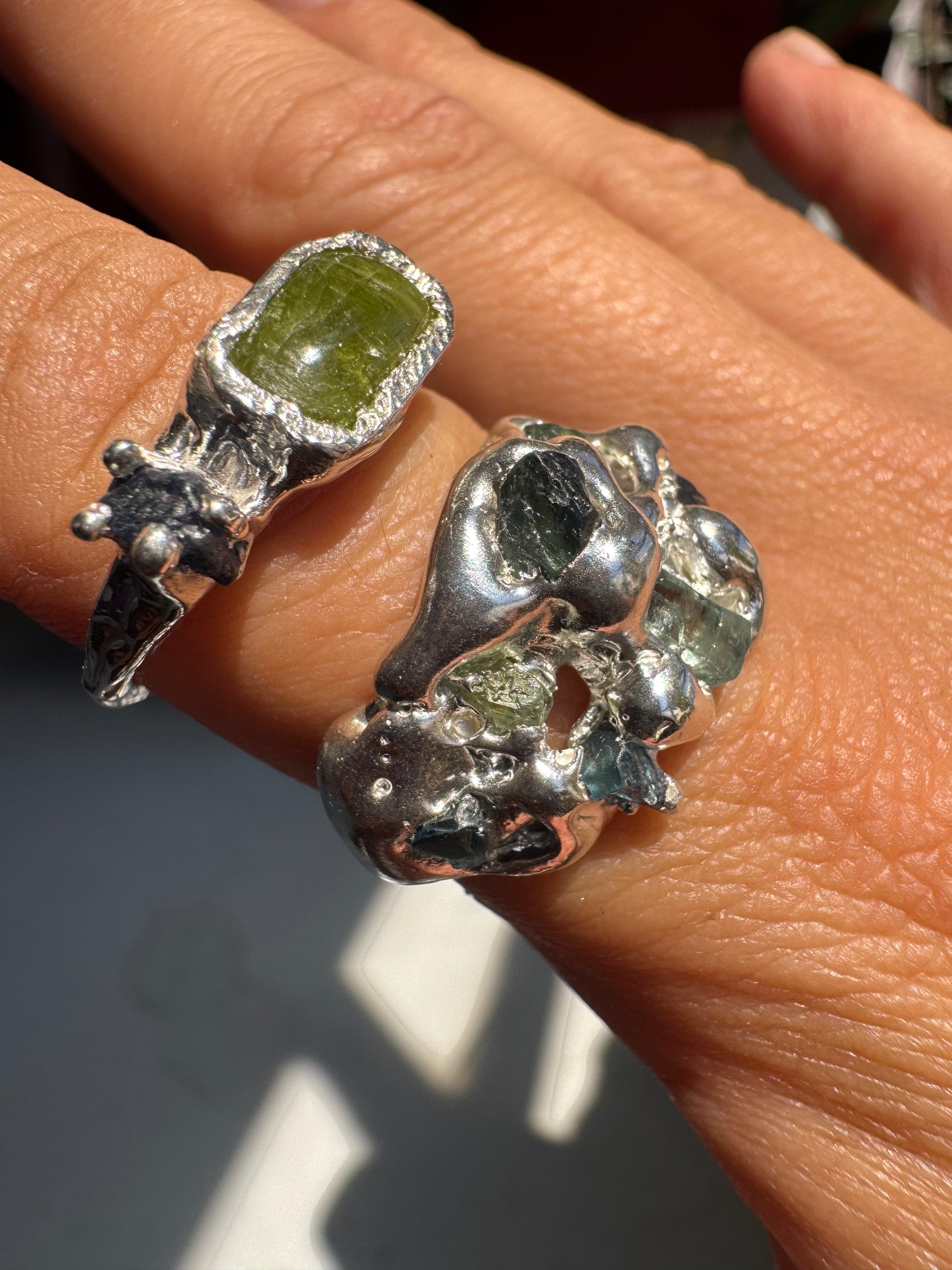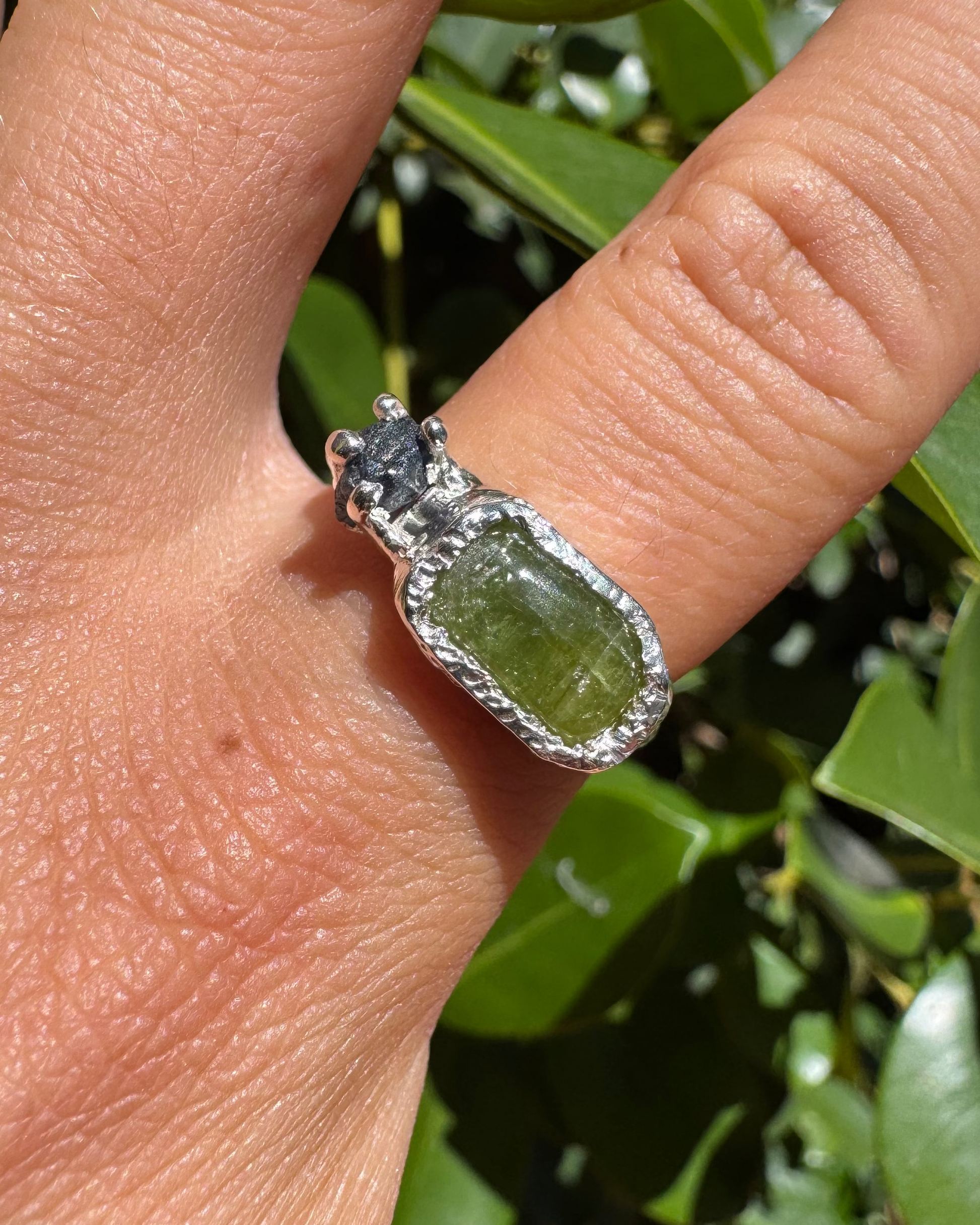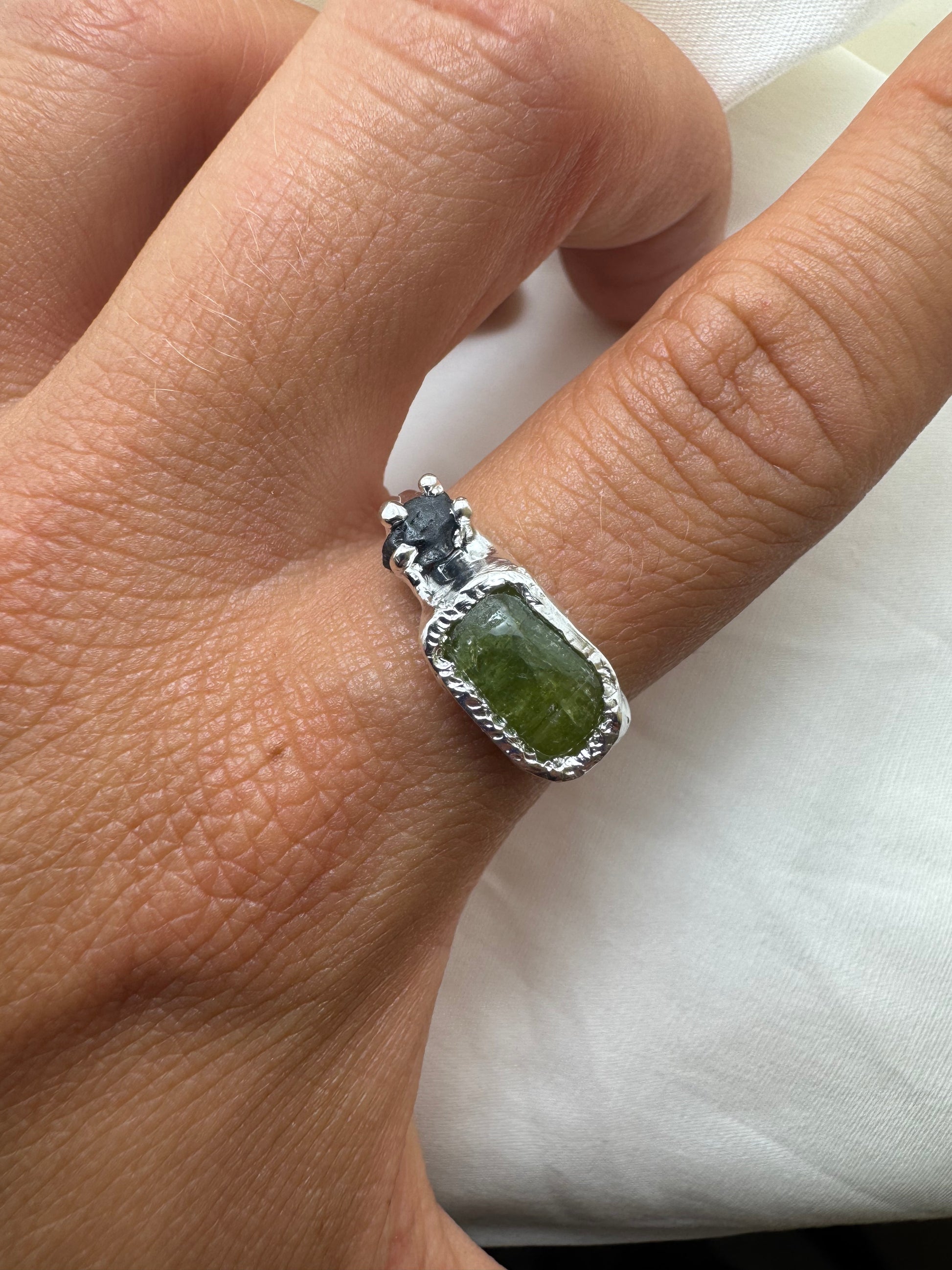 Duo is a one off, hand crafted using 925 sterling silver with natural green tourmaline and raw sapphire.