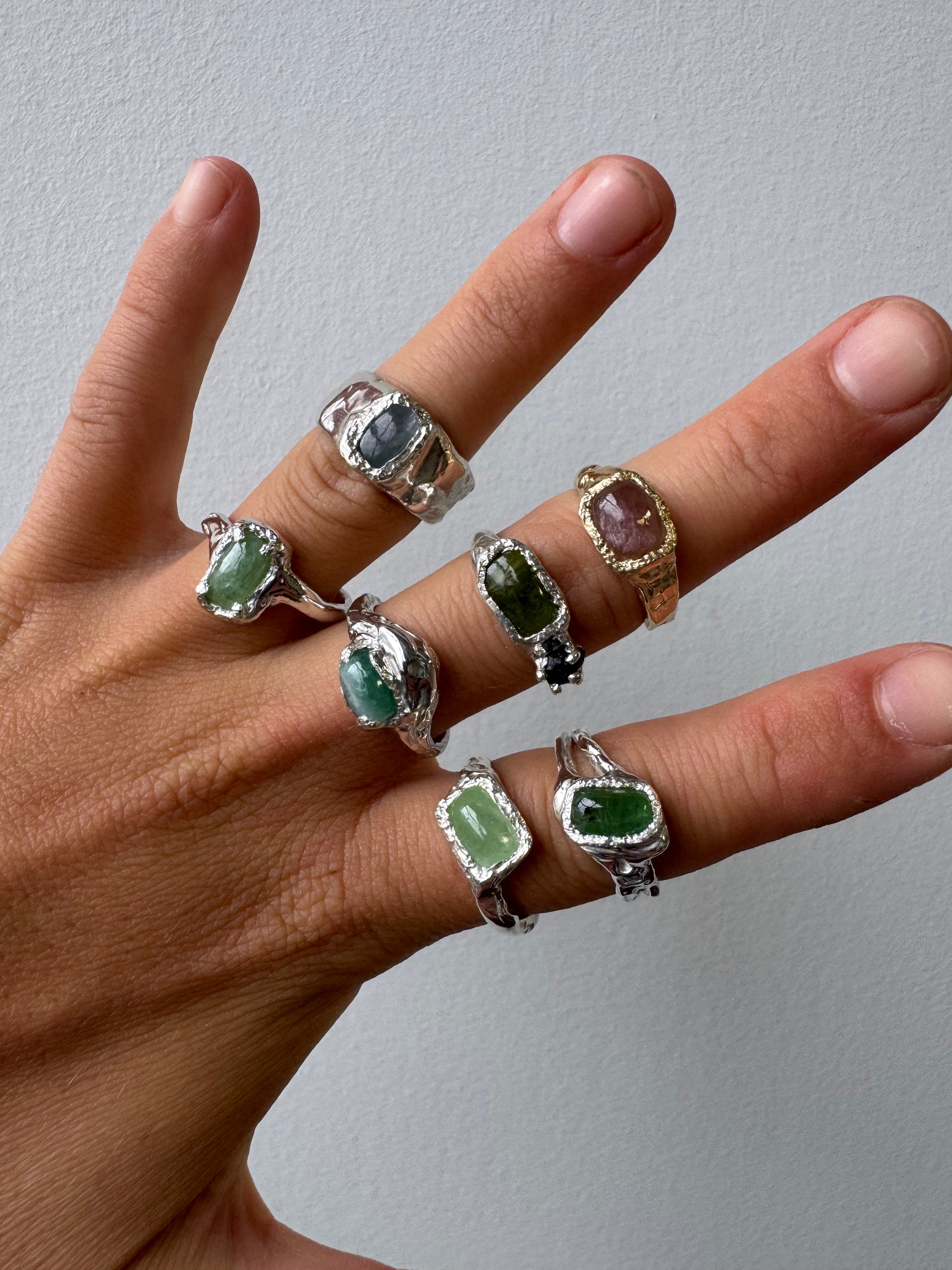 ‘Ready to ship’ is a collection of one-off pieces already sized and ready to wear. In this collection I explore different forms of metals and gemstones, creating something new every time.