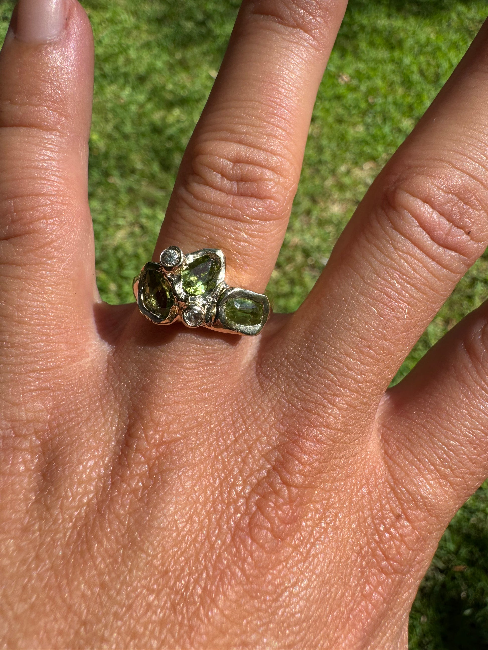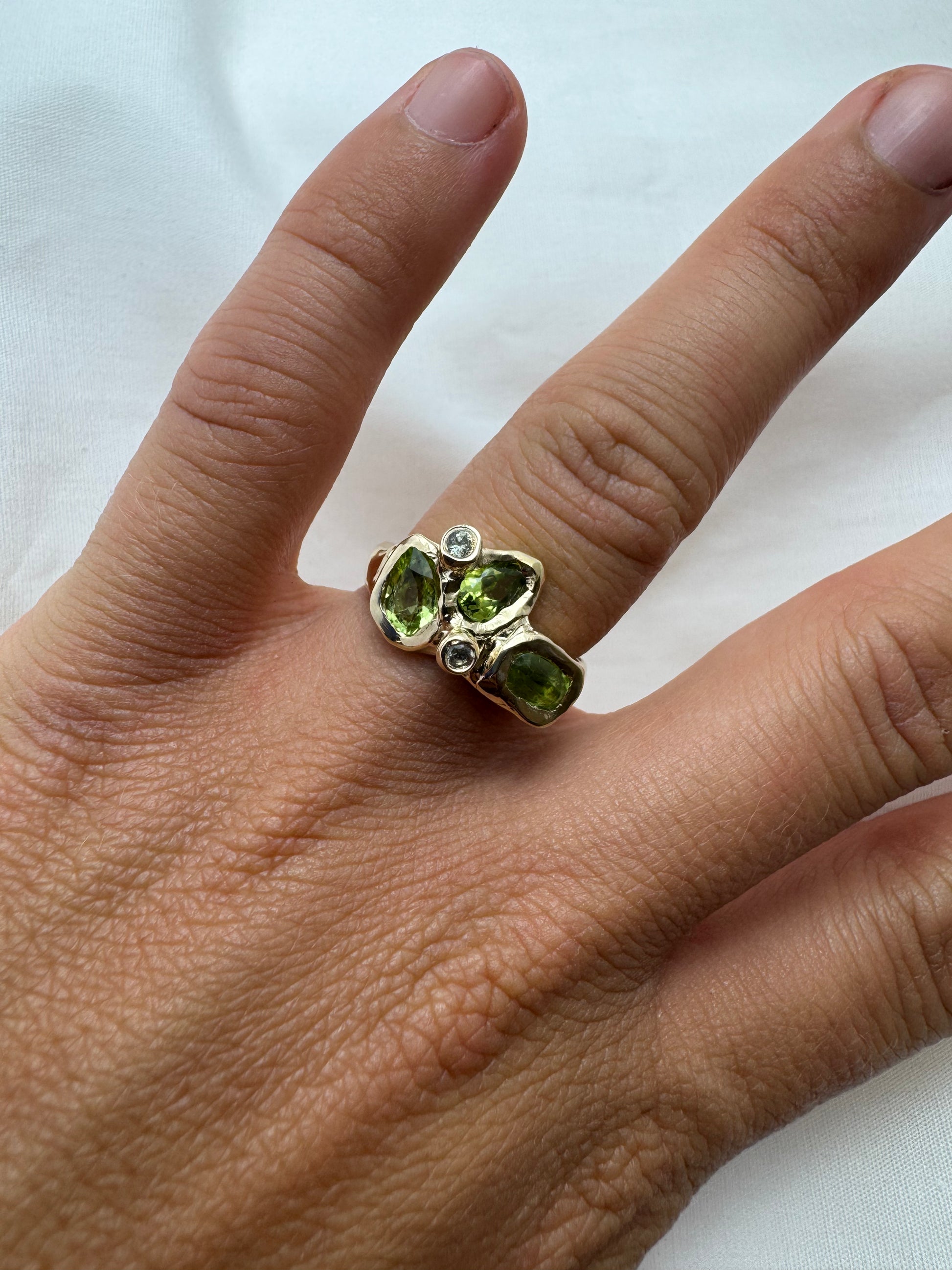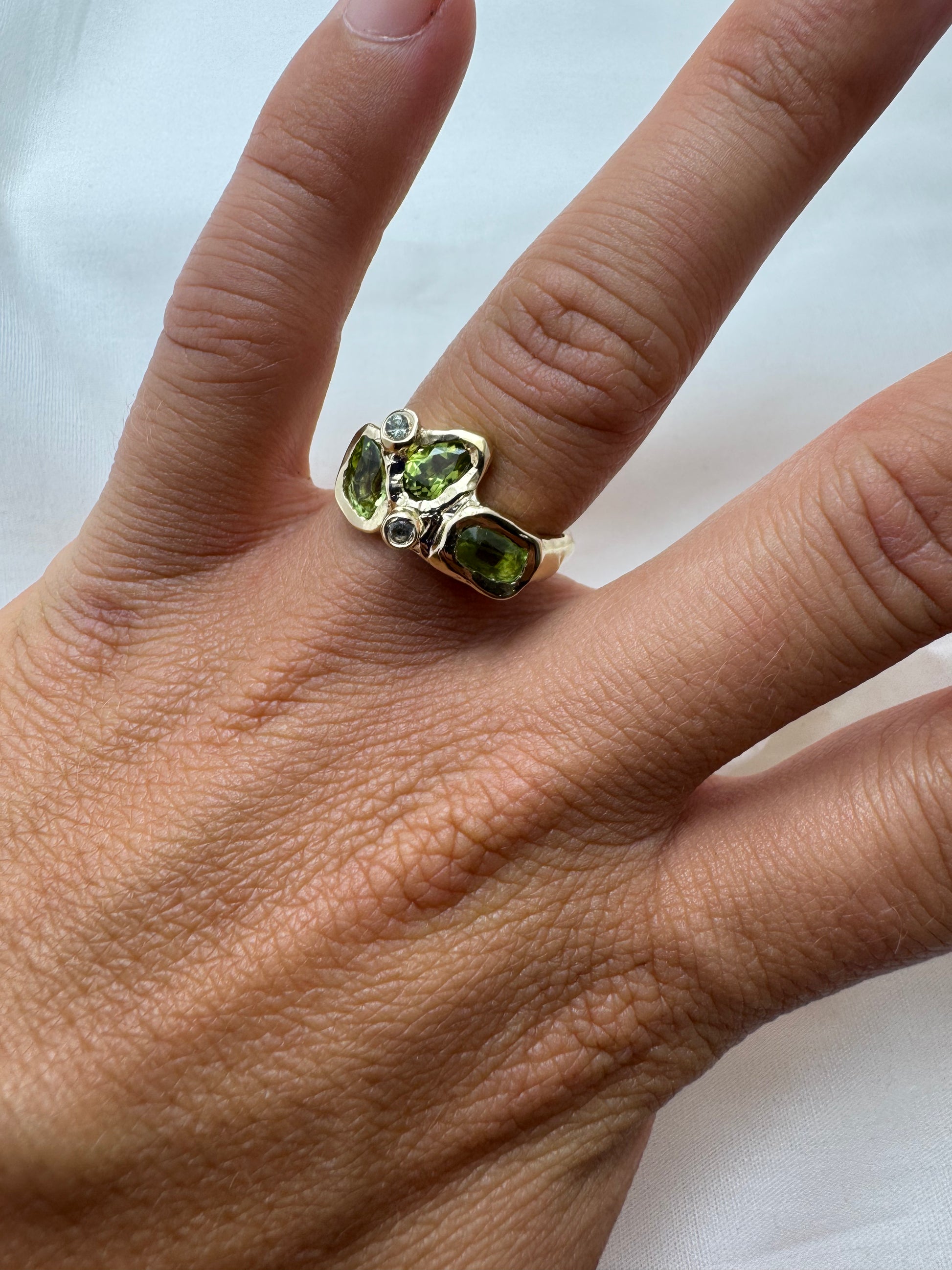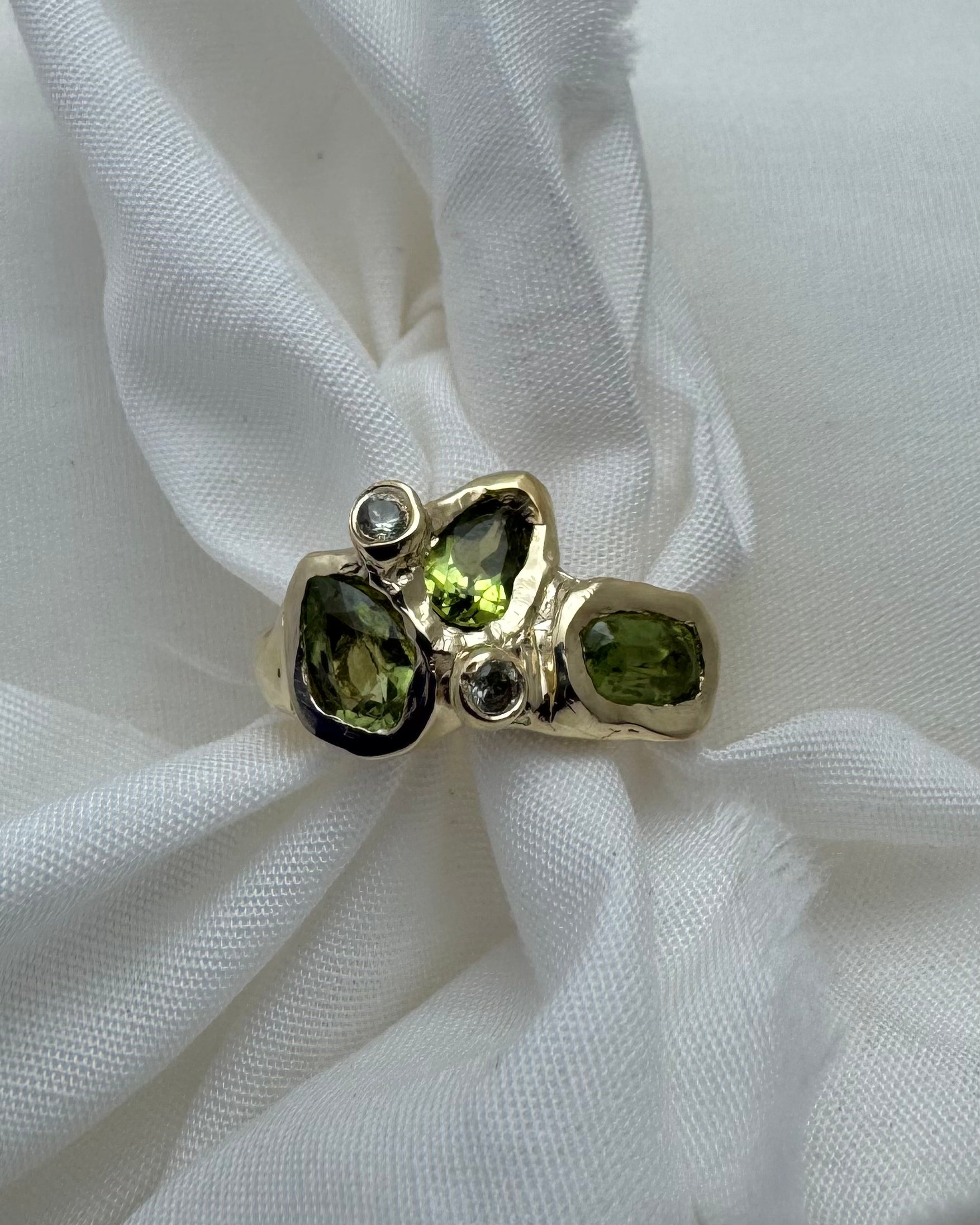 Petals is a one off, hand crafted using 9Y gold with 3 x peridot and 2 x green sapphire.