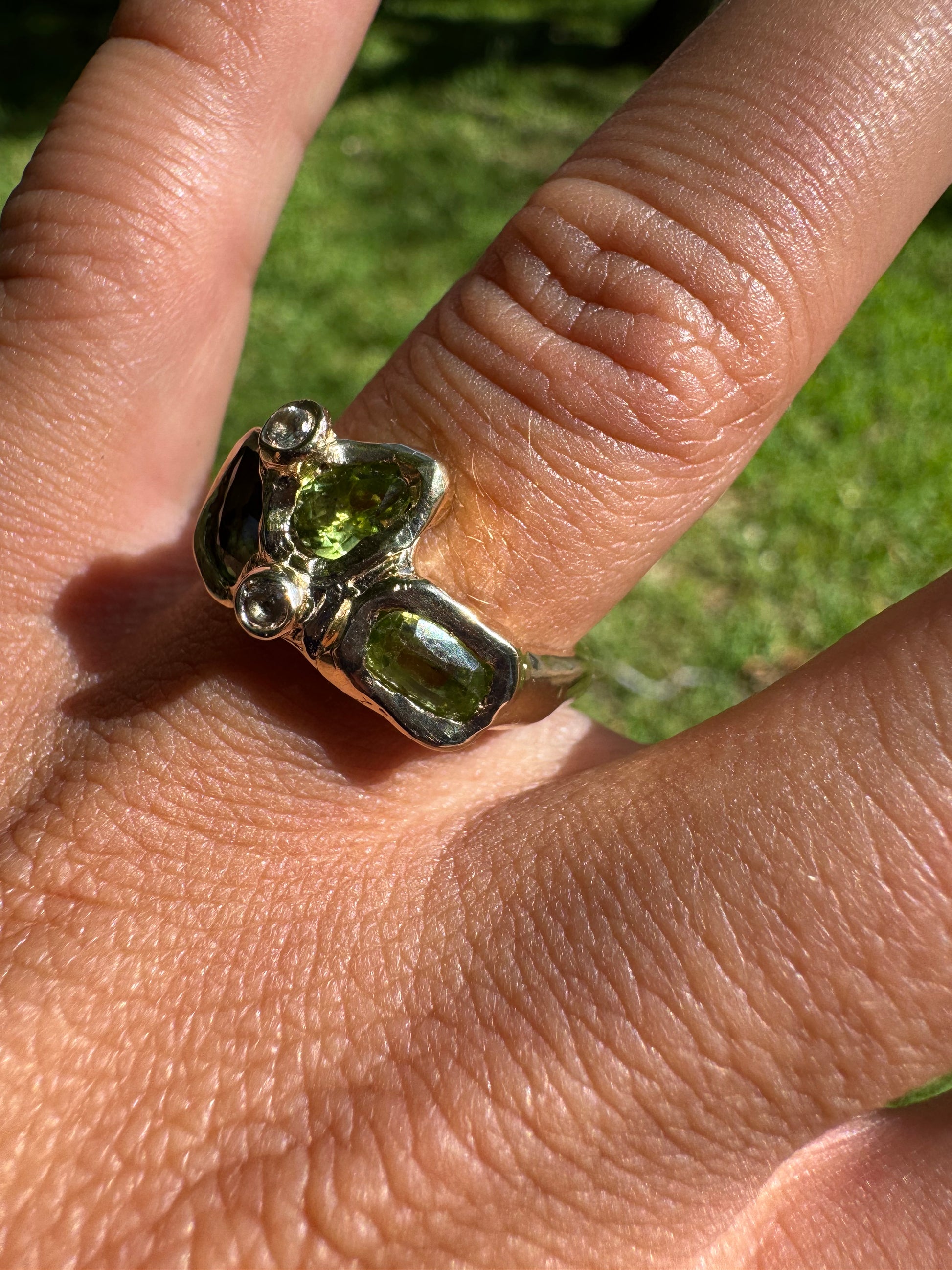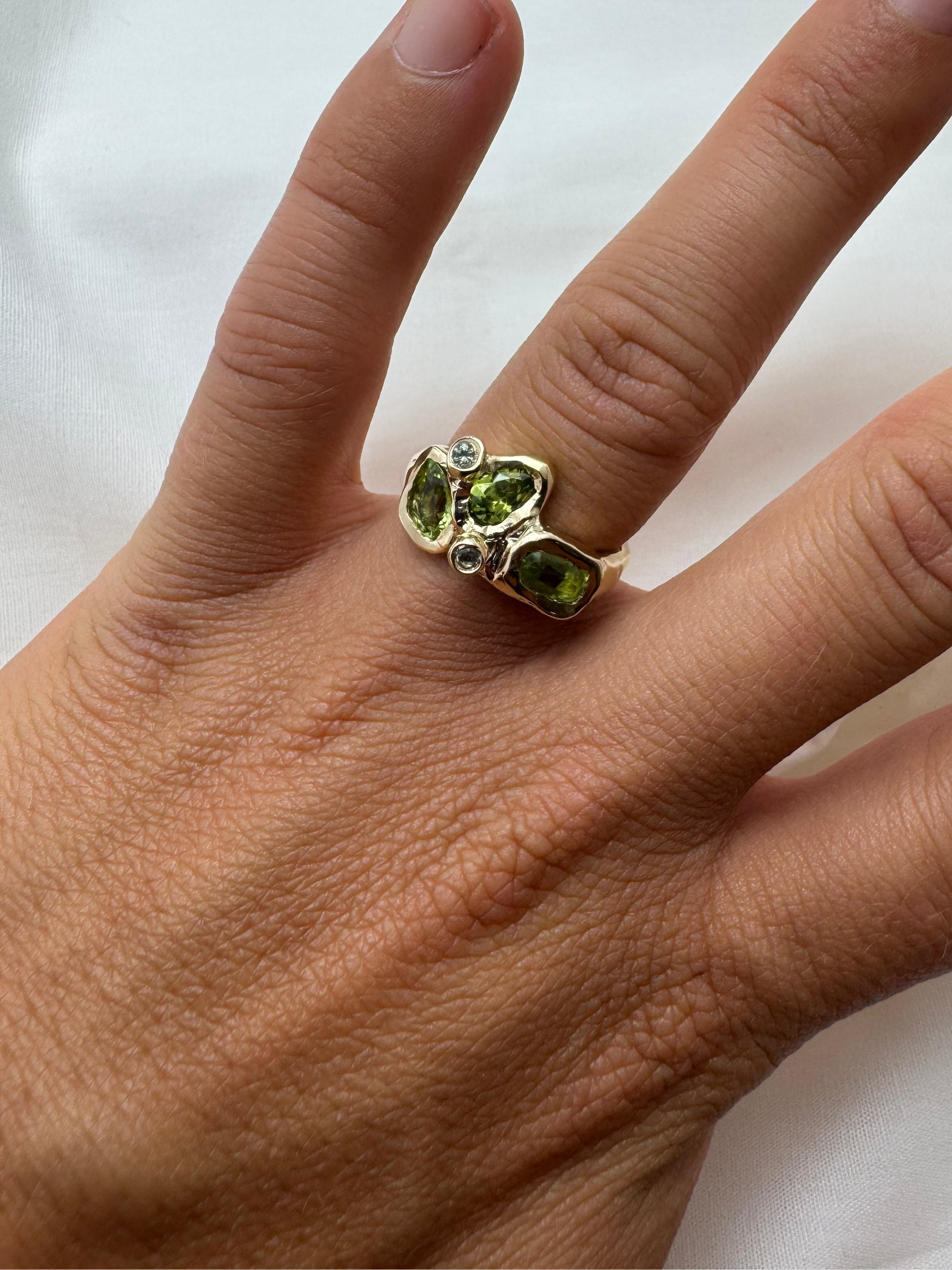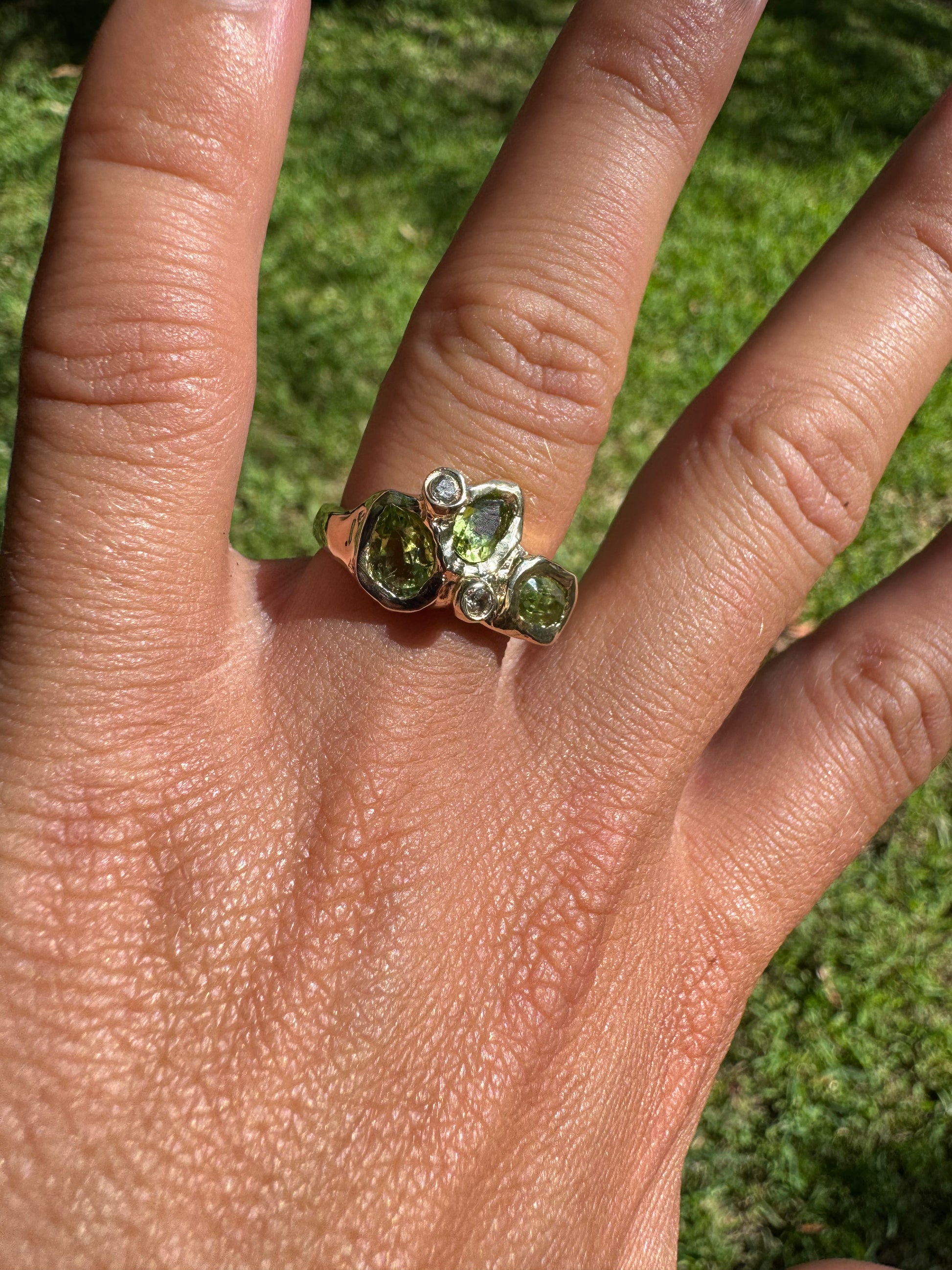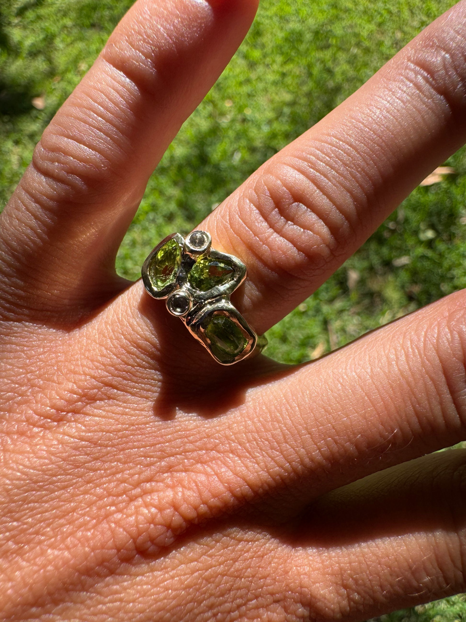 Petals is a one off, hand crafted using 9Y gold with 3 x peridot and 2 x green sapphire.