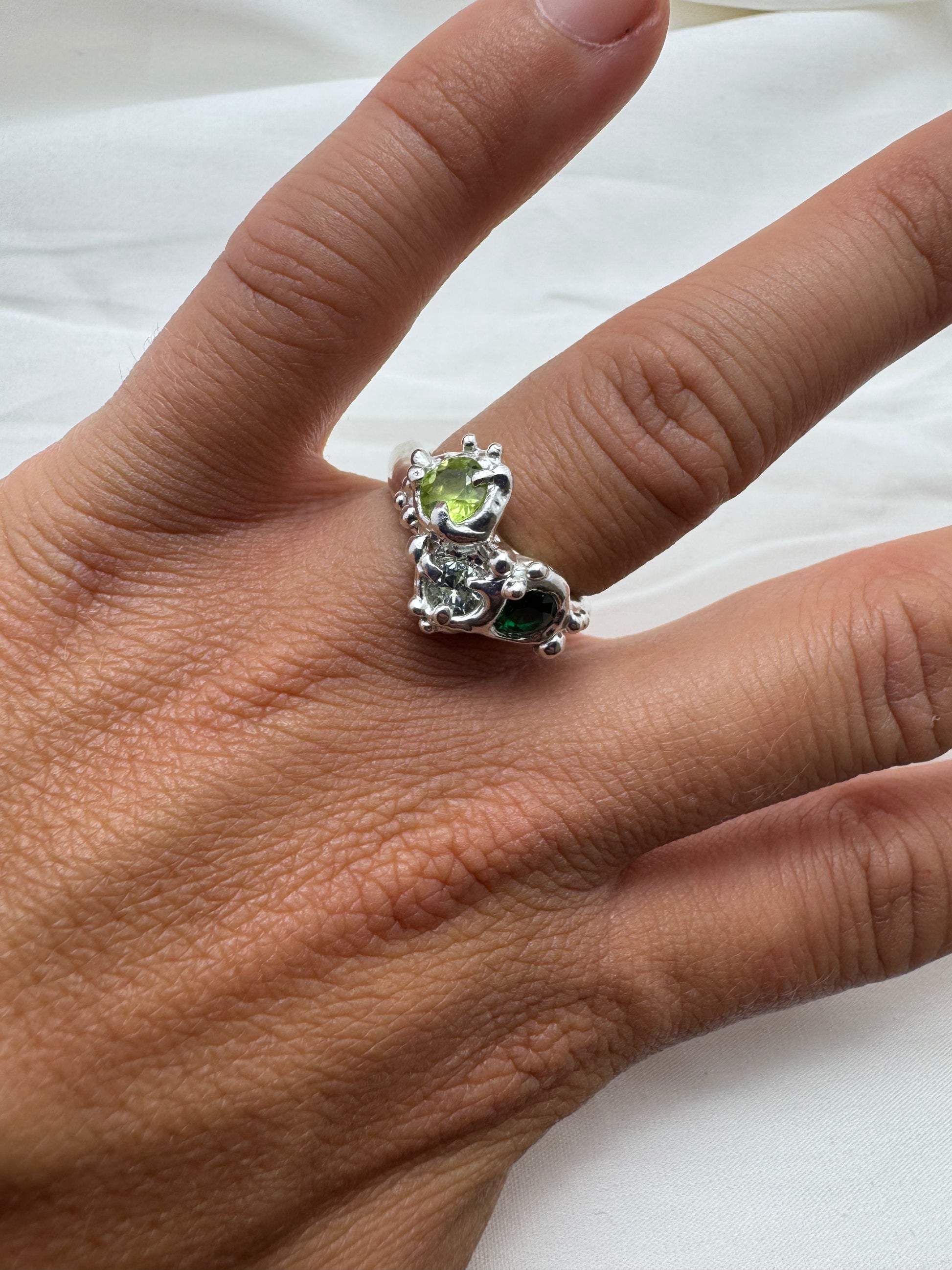 Shades is a one off, hand crafted using 925 sterling silver, emerald, amethyst and peridot.